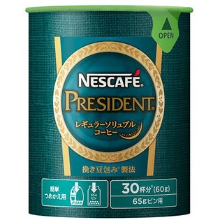 ネスカフェ プレジデントは、微粉砕した焙煎コーヒー豆の粒を包み込む「挽き豆包み製法」で、淹れたての豊かな香りとコーヒー本来の味わいを楽しめる「レギュラーソリュブルコーヒー」です。