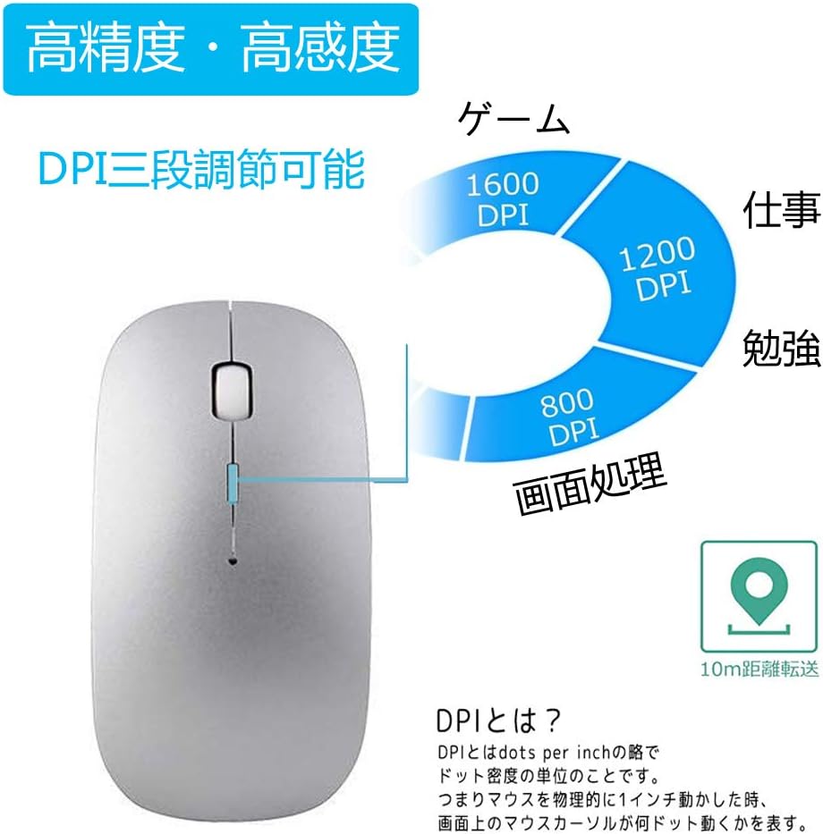 【斬新な設計】高級感のある滑らかな質感になっており、軽くて薄くて肌触りが良いです。人間工学デザインが採用され、長時間使用しても手が疲れにくいです。800/1200/1600DPIの間で自由に切り替えることが可能です。カーソルの移動スピードが簡単に変更できて、仕事やゲームにも最適です。