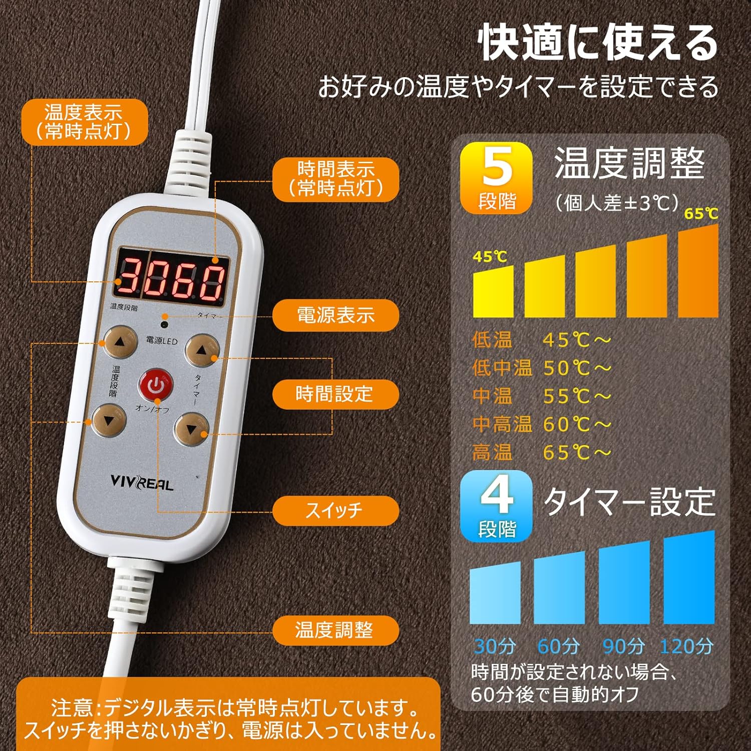 【2021最新版ホットマット、温度調節&タイマー機能付】改良版の電熱線が内蔵されており、加熱効果が向上するだけでなく、耐久性も大幅に向上します。さらに、ホットマットの電熱線の伝熱面積を広くさせて、快速均一に加熱できます。真冬に重宝すること間違いなしの一品です。45℃-65℃に5段階温度を調節でき、好みの温度に設定できます。さらに、0.5h・1h・1.5h・2h4段階タイマーを自由に設定でき、時間経過すると自動的にオフします。タイマー設置を忘れても、1時間後自動的に電源が切れます。ご使用の環境に応じて細かく調節ができます。