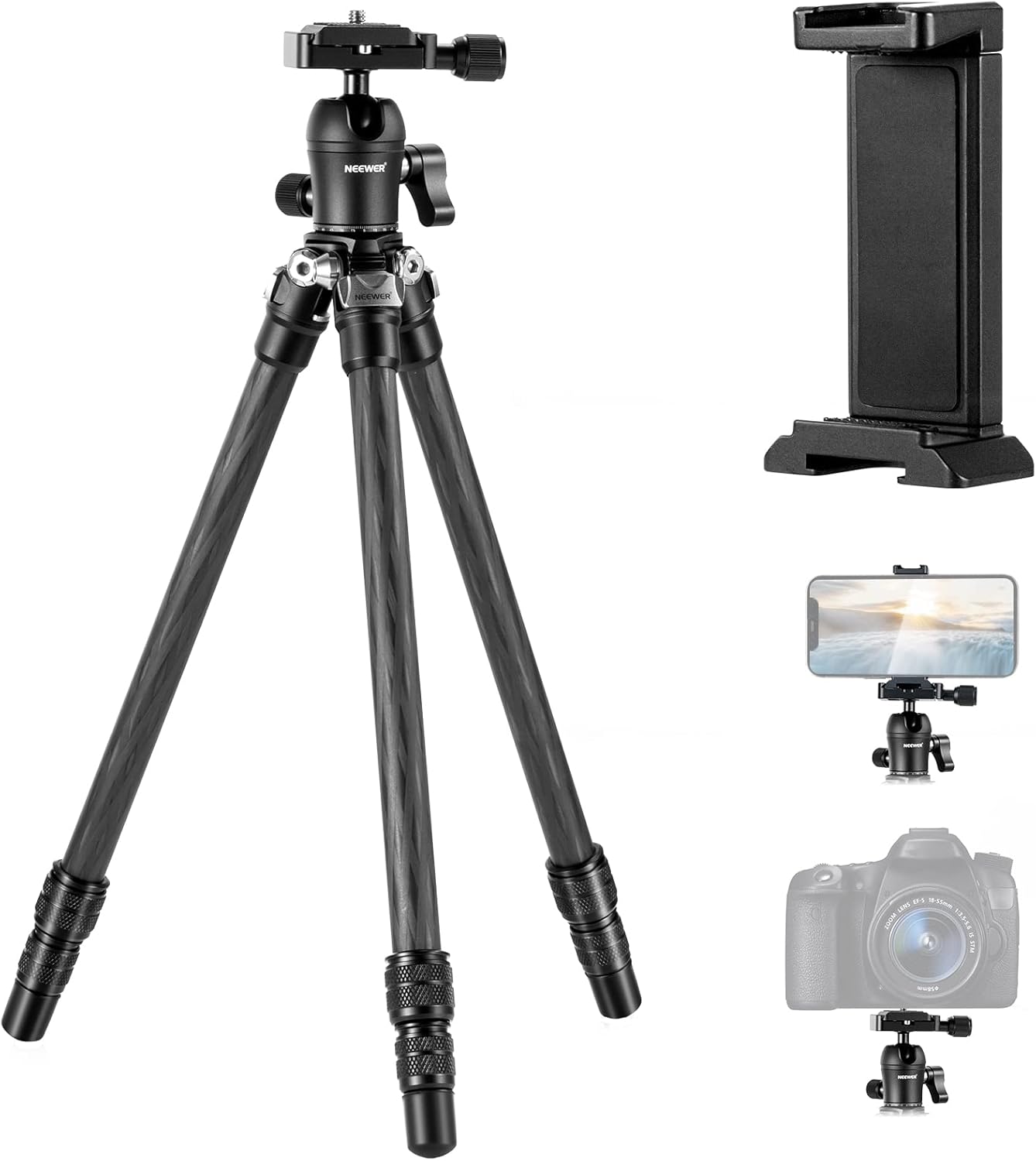 NEEWER 28″/72cm カメラ三脚 カーボンファイバー製 スマホホルダー レッグスパイク 360°パノラマボールヘッド付き 軽量でコンパクト 動画ブログ旅行用 三脚スタンド ミラーレスカメラとスマートフォン用☆