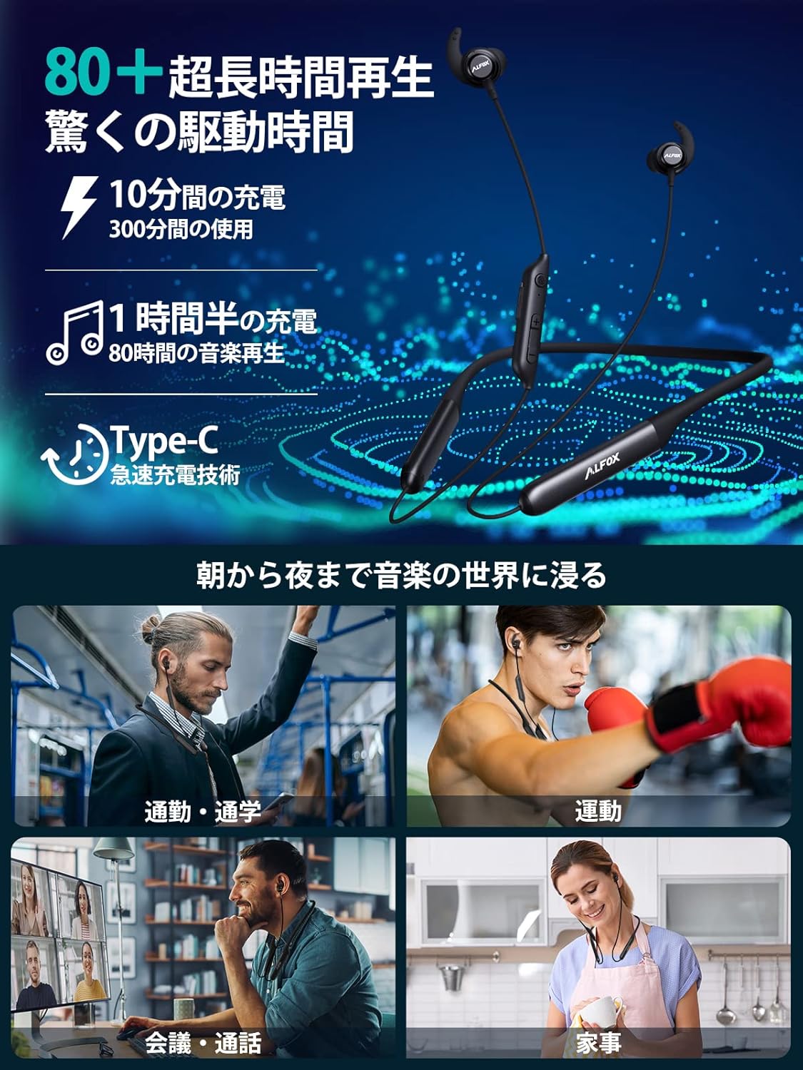 Alfox ワイヤレスイヤホン ネックバンド型 80時間連続再生 Bluetooth5.2対応 業界革新版 完全ワイヤレス