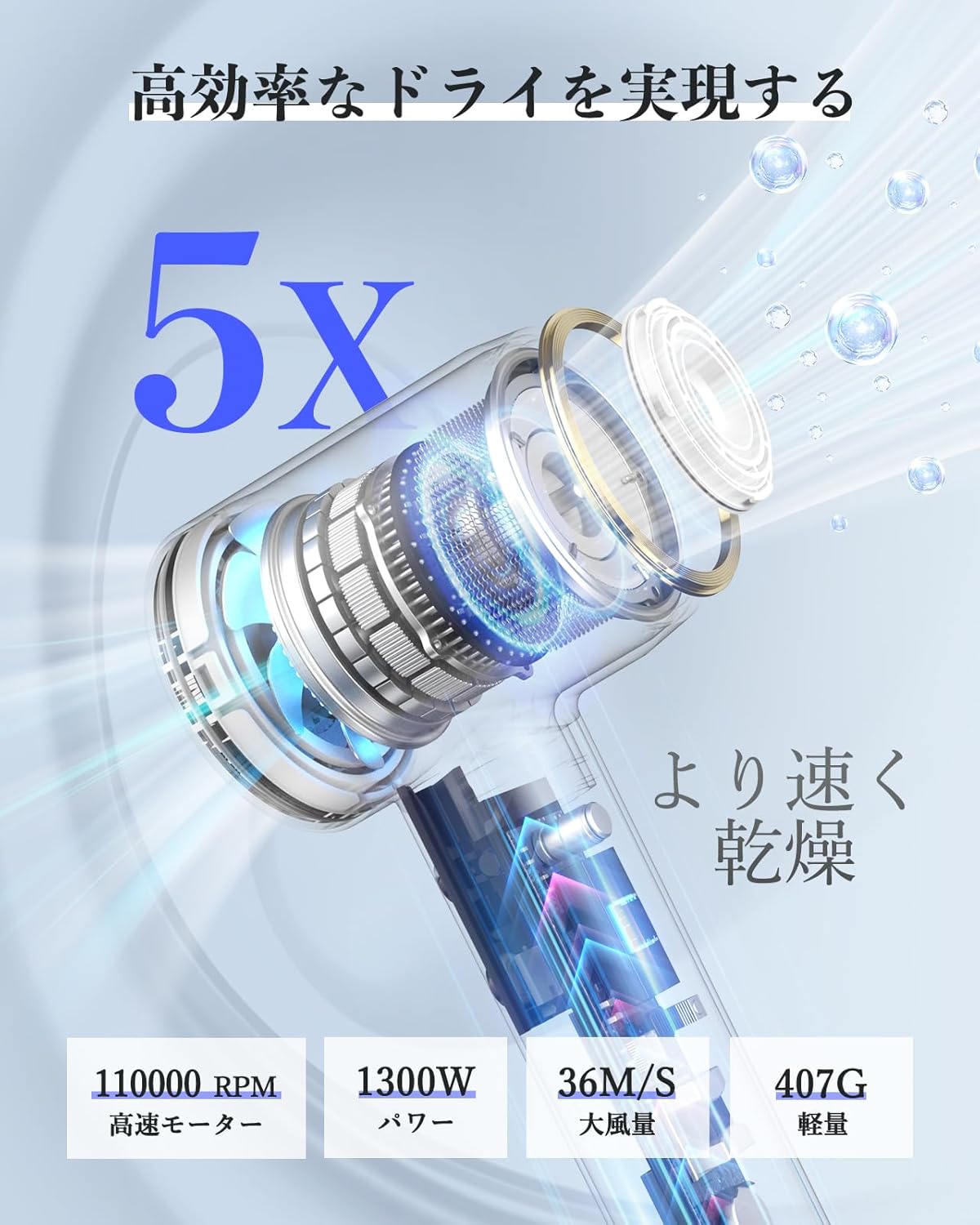 Bopwavy ドライヤー 速乾 大風量【3億マイナスイオン・温冷風のサイクル】 新型高風速ドライヤー 110000回転/分の強力モーター 1~2分速乾