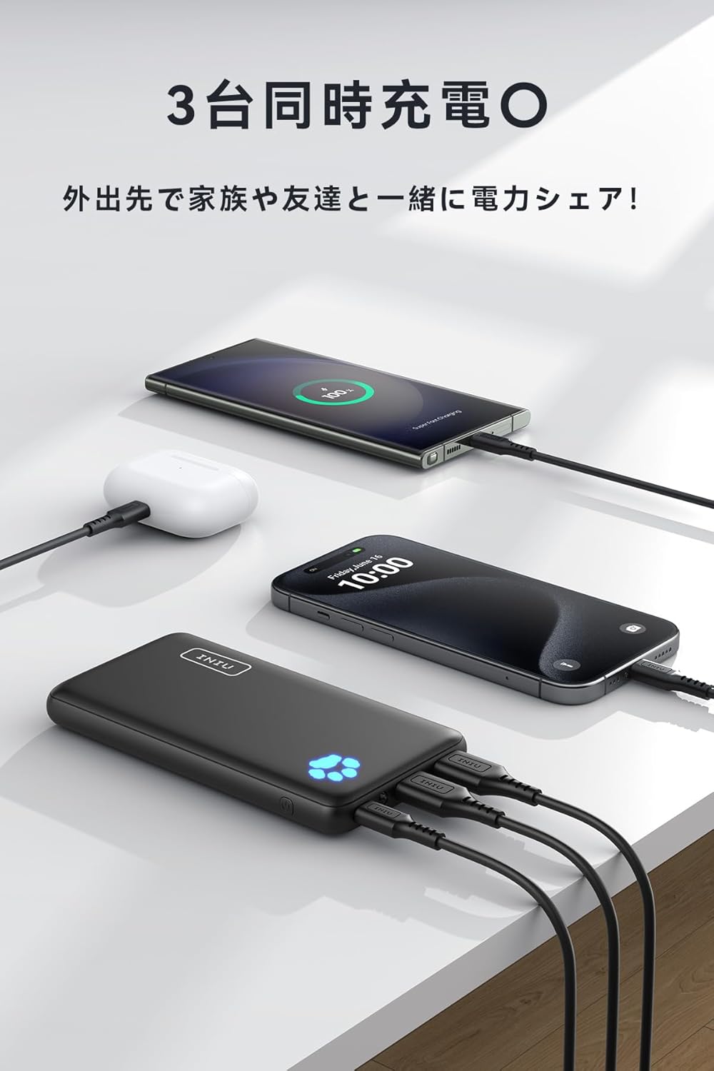 軽量 小型 3台同時充電【USB-C 入出力×1 & USB-A 出力×2 PSE認証済】ポータブル 薄型 アウトドア/災害/緊急用の便利グッズ iPhone 16 / 15 & Android iPad その他各種対応 日本語取扱説明書付き【ブラック】