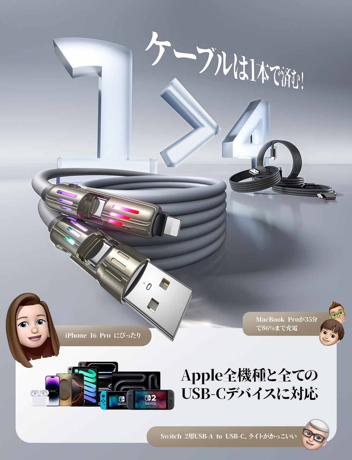 LISEN 4in1 充電ケーブル【2M, 最大240W】マルチシリコーン, 急速充電ケーブル 480Mbps データ転送, C to C/タイプc ライトニング/USBA to USBC/Lightning☆