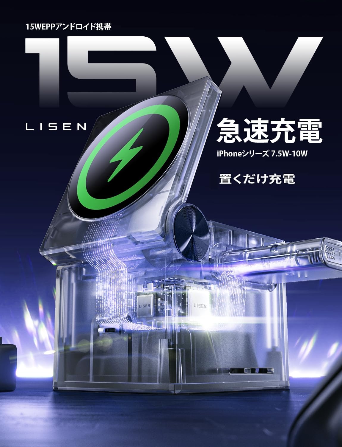 LISEN 3in1 ワイヤレス充電器 マグセーフ充電器 magsafe 置くだけ充電 折り畳み式15W/10W/7.5W/5W 充電スタンド