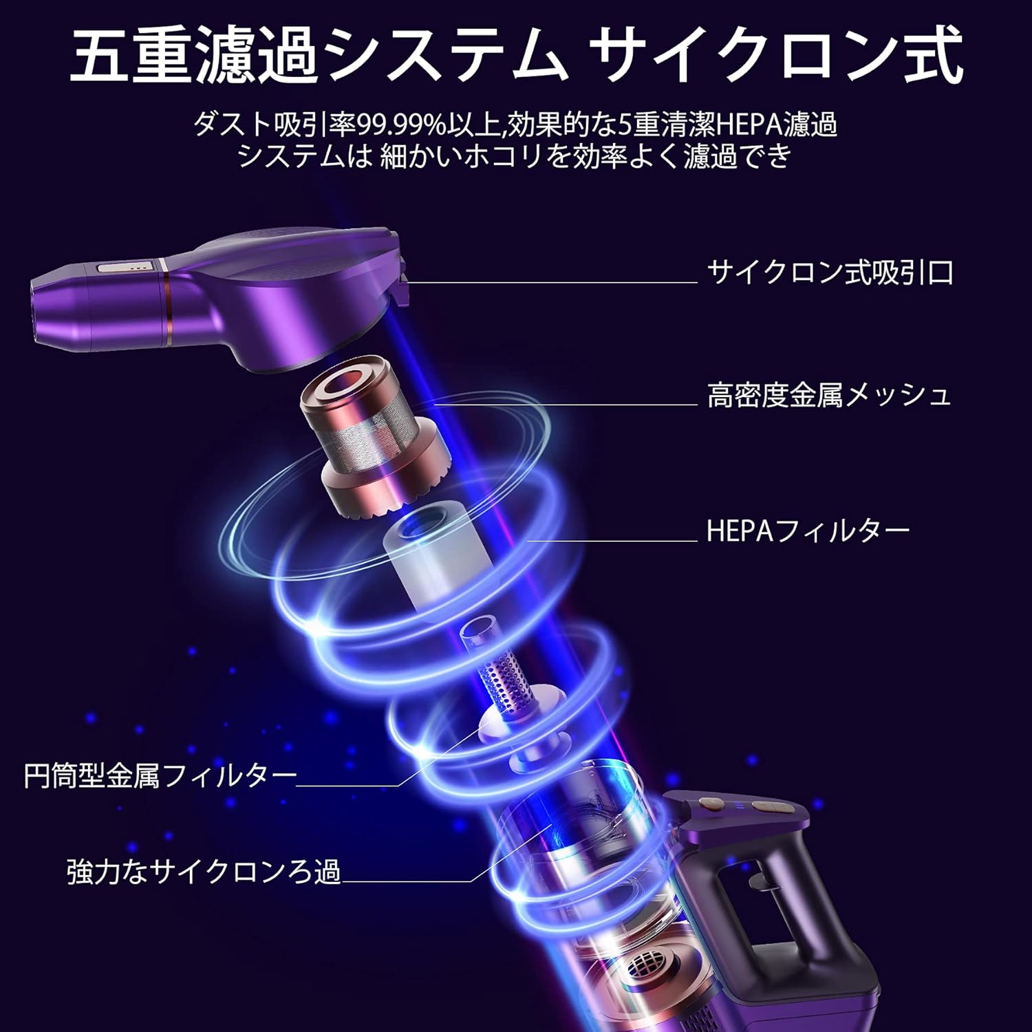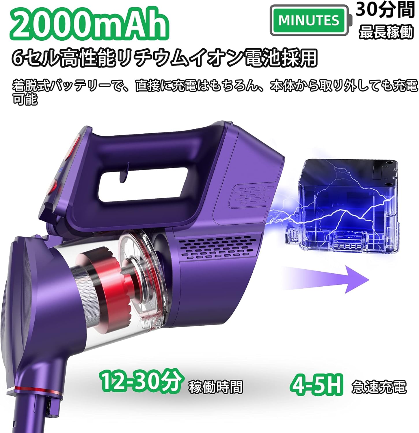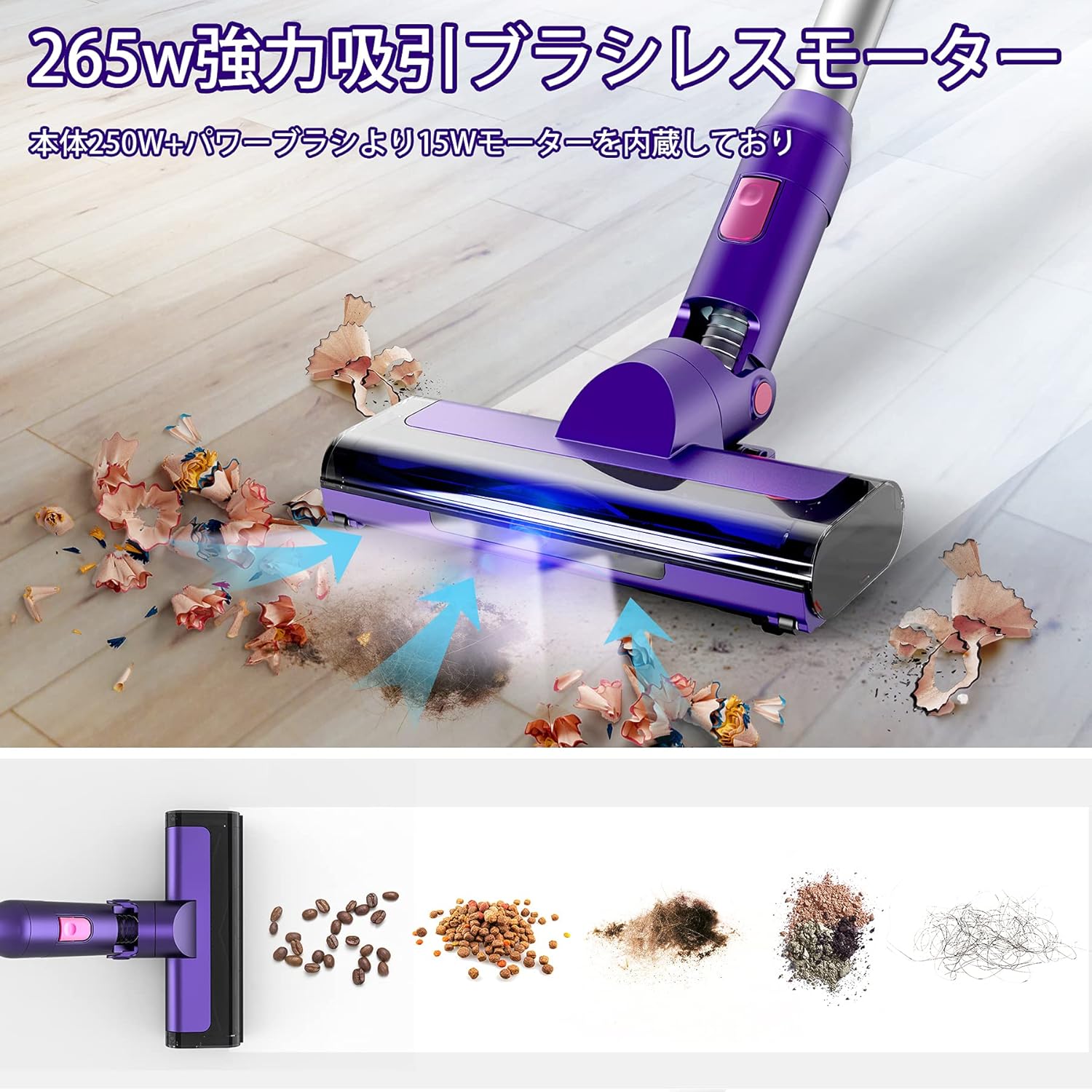 265W 超強吸引力 最大30分稼働 五つの濾過システム 着脱式バッテリー 2WAY ブラシレスモーター パワーヘッド LEDライト付 壁掛け 軽量 0.5L パープル